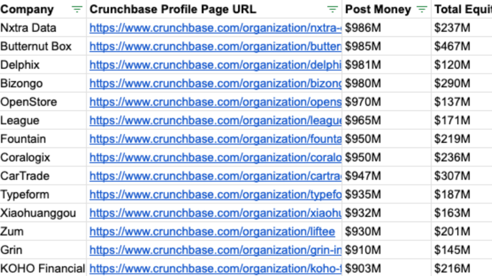 Crunchbase Emerging Unicorn Board Dataset(CSV): 436 companies valuated b/w $500 million-$1 billion--Company Name, Profile URL, Post Money Value, Total Equity Funding, Leading Investors, Country/Continent