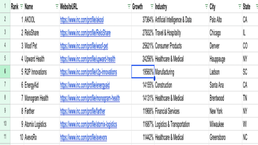 Full List of the latest(2025) Inc 5000 list of fasting growing private companies. List in CSV & PDF downloads.
