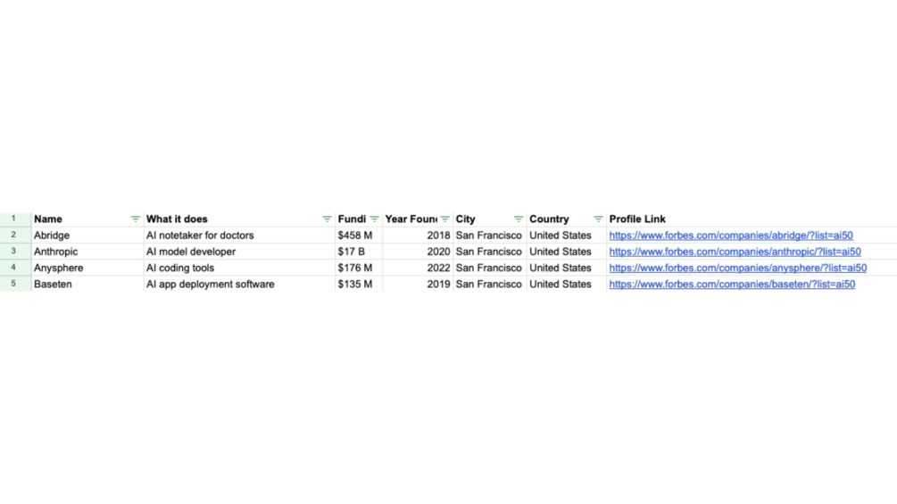 Top AI 50 List Dataset(CSV) + Visual Landscape Chart (PNG): Company Name, What It Does, Funding, Year Founded, City, Country, Profile Link